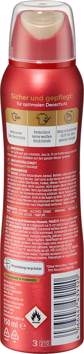 مع مزيل العرق Glamorous Moment Perfume من Balea، يتم الجمع بين حماية بخاخ مزيل العرق ورائحة العطر الساحر. تجمع التركيبة النباتية بين الفروق الدقيقة في الأزهار والروائح الشرقية وتضمن عطرا يدوم طويلا في جميع أنحاء الجسم. بالإضافة إلى ذلك ، لا يترك الرذاذ أي بقايا بيضاء ويوفر حماية مثالية لمزيل العرق. تمت صياغته بدون لدائن دقيقة وبوليمرات اصطناعية بحتة قابلة للذوبان في الماء.