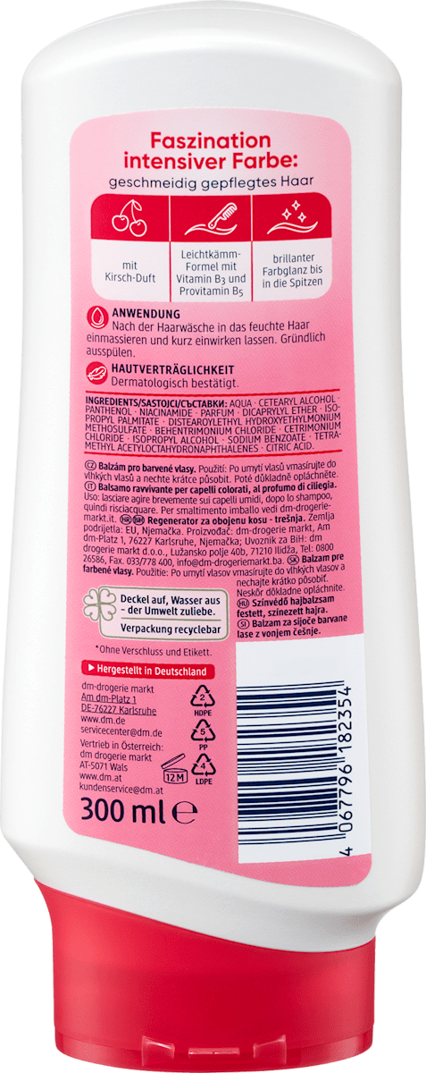 يوفر بلسم Balea’s Colour Gloss تركيبة خاصة للألوان والعناية تغذي الشعر المصبوغ والملون بشكل مكثف. غني بفيتامين ب 3 وبروفيتامين ب 5 ، ويضمن شعرا ناعما ومعتنى به جيدا ولمعانا لامعا حتى الأطراف. تكمل رائحة الكرز اللطيفة تجربة الرعاية ويدعم التمشيط السهل بتركيبة خاصة. تمت صياغته بدون لدائن دقيقة وبوليمرات اصطناعية بحتة قابلة للذوبان في الماء.