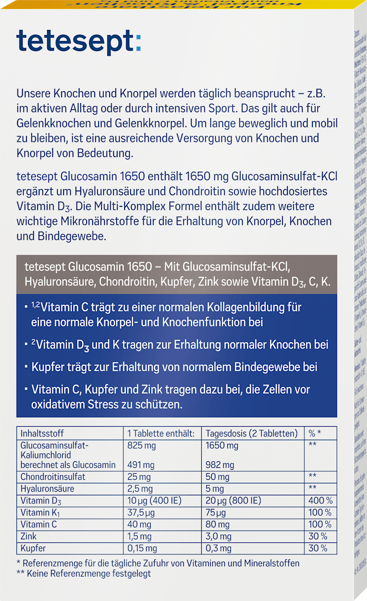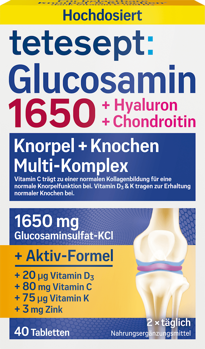 كبسولات tetesept Glucosamin 1650 هي مكمل غذائي يحتوي على 1650 ملغ من غلوكوزامين سلفات KCl، ومُدعَّم بالإضافة إلى ذلك بحمض الهيالورونيك والكوندرويتين وفيتامين D3 بجرعة عالية. يساعد النحاس الموجود على الحفاظ على النسيج الضام الطبيعي، بينما يمكن لفيتامين C دعم إنتاج الكولاجين الطبيعي لدعم وظيفة الغضاريف والعظام الطبيعية. يساهم فيتامين D3 وK في الحفاظ على صحة العظام الطبيعية. بفضل شكل الكبسولة العملي، يمكن تناول هذا المزيج الخاص بسهولة ودمجه في الحياة اليومية بسهولة.