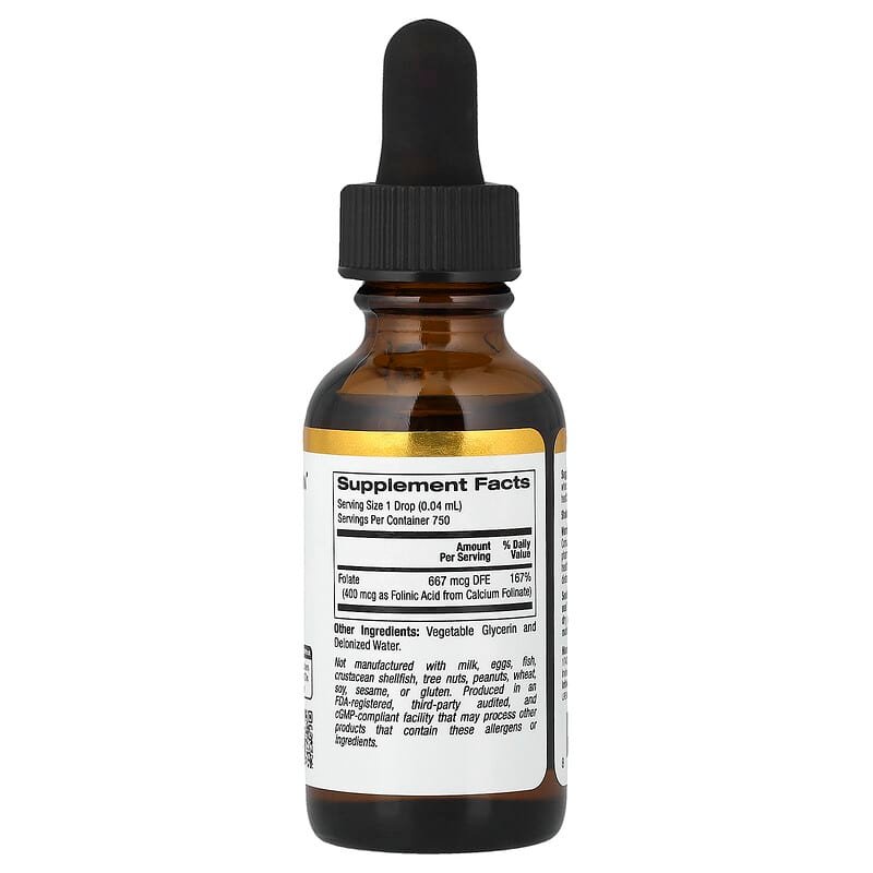 حمض الفوليك من California Gold Nutrition هو شكل نشط بيولوجياً للفولات في شكل سائل خالي من الكحول. كل قطرة تحتوي على 667 ميكروغرام مكافئ للفولات الغذائي (ما يعادل 167٪ من المكافئ اليومي للفولات للشخص كما حدده وزارة الصحة والخدمات الإنسانية الأمريكية).