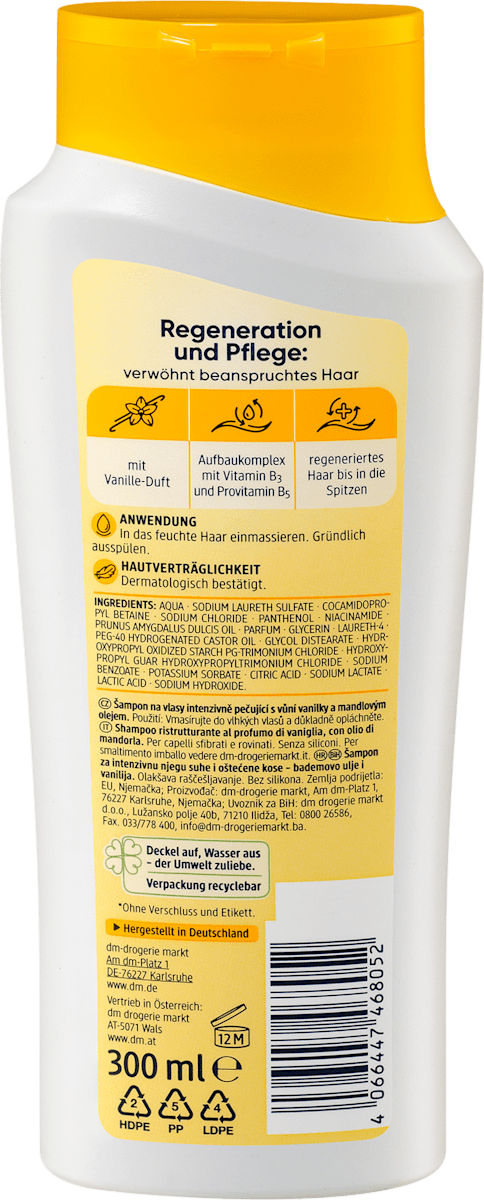 التجديد والعناية: شامبو باليا للعناية المركزة يُدلل الشعر المتعب برائحة الفانيليا ومركب التجديد المُعزز بفيتامين ب3 وبروفيتامين ب5 – لشعر مُجدد حتى الأطراف. مُعتمد من قِبَل أطباء الجلدية. تركيبة خالية من البلاستيك الدقيق والبوليمرات الاصطناعية القابلة للذوبان في الماء.