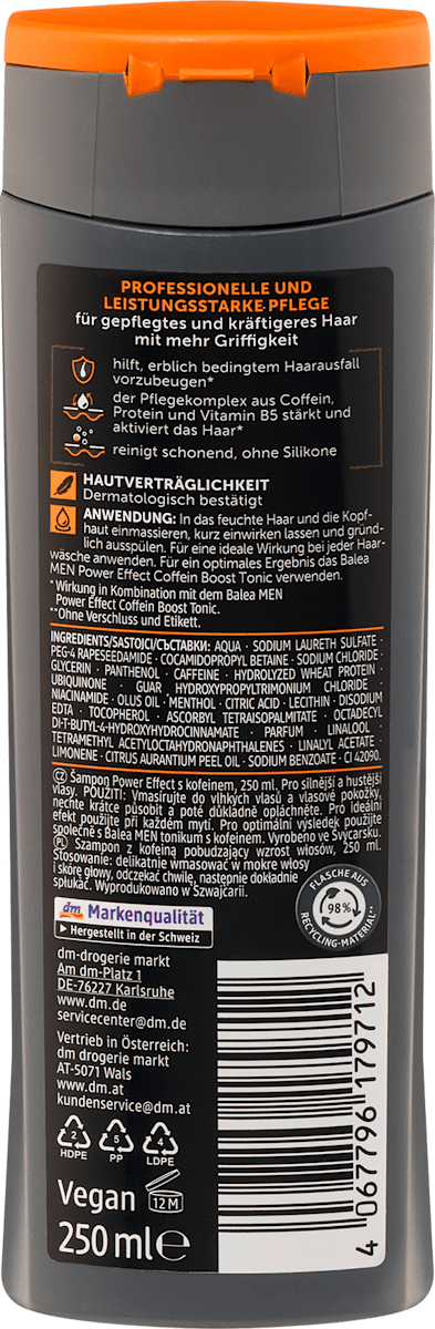 تعزيز الطاقة لشعر رجالي أقوى ومعتنى به جيدا مع مزيد من القبضة: يساعد شامبو Power Effect Caffeine من Balea MEN على منع تساقط الشعر الوراثي. يتغلغل مركب المكون النشط الذي يحتوي على الكافيين بعمق في جذر الشعر ويقوي وينشط جذور الشعر الضعيفة. كما أنه ينظف فروة الرأس وينعشها بلطف. بدون سيليكون. تمت صياغته بدون لدائن دقيقة وبوليمرات اصطناعية بحتة قابلة للذوبان في الماء. * بناء على مجموع المكونات العضوية الفردية ** وفقا لمنظمة التعاون الاقتصادي والتنمية 301 أو 302 أو ما يعادلها *** تأثير *** بالاشتراك مع Balea MEN Power Effect Caffeine Boost Tonic