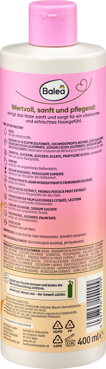يضفي شامبو Natural Beauty المنشط من Balea حيوية منعشة للعناية بالشعر. مع مستخلص الخوخ العضوي وماء الأرز ، ينظف بلطف ويترك الشعر منتعشا. لا تحتوي التركيبة الخفيفة على أي سيليكون أو كبريتات وقد تم اختبارها من قبل أطباء الجلدية للتأكد من توافقها مع البشرة. المكونات المغذية مثل السوربيتول والجلسرين تمنح الشعر ملمسا لطيفا ، بينما توفر مضادات الأكسدة مثل توكوفيرول والأسكوربيل بالميتات حماية إضافية للشعر. تمت صياغته بدون لدائن دقيقة وبوليمرات اصطناعية بحتة قابلة للذوبان في الماء.