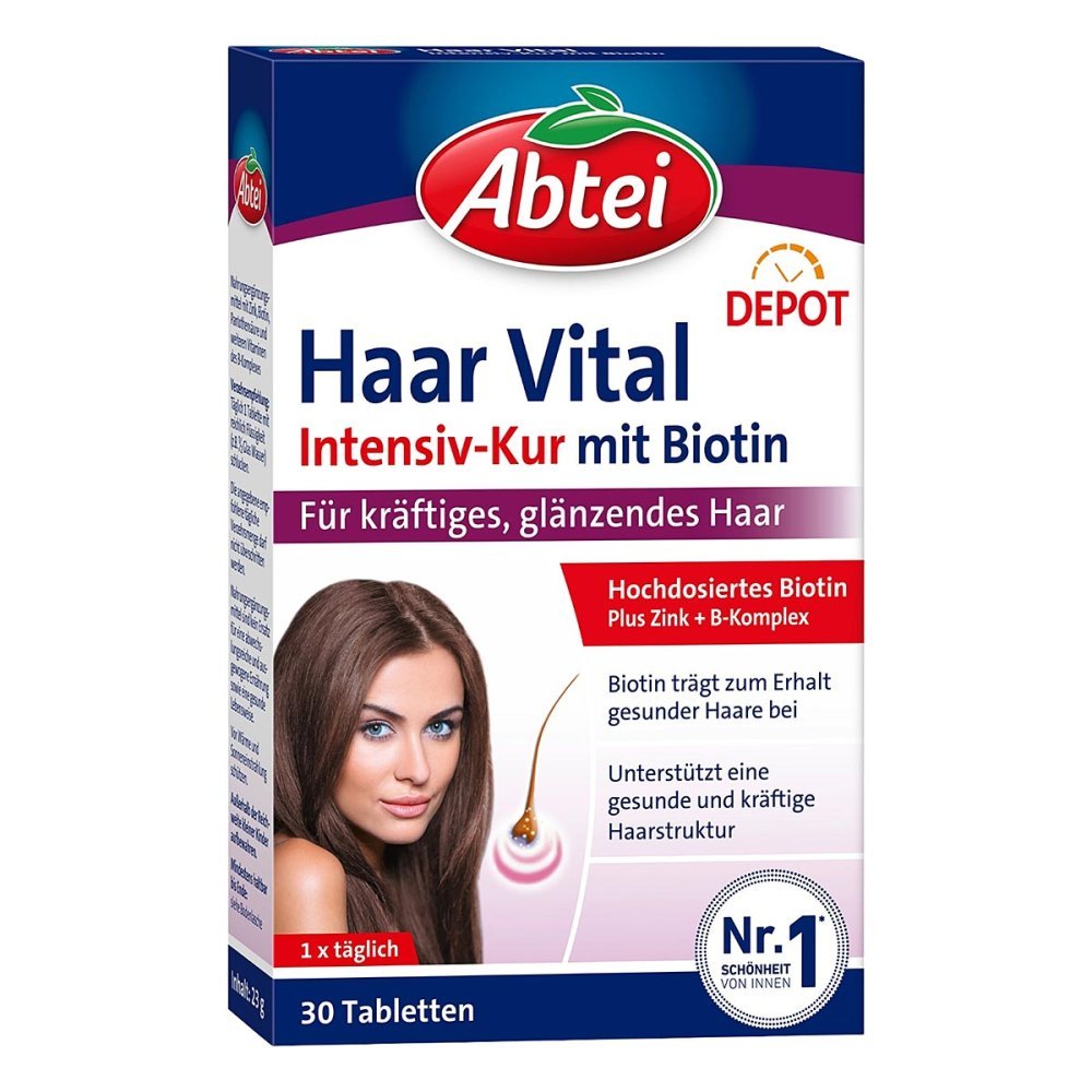 يقدّم علاج Abtei Haar Vital Intensiv-Kur على شكل أقراص صغيرة تركيبة خاصة من العناصر الغذائية المختارة. وبفضل محتوى البيوتين والزنك، يمكن أن يساهم في الحفاظ على الشعر الطبيعي. كما أن النياسين الموجود يمكن أن يساهم أيضًا في الحفاظ على صحة الجلد، وبالتالي صحة فروة الرأس. ومن خلال التأثير الخاص للتخزين التدريجي، يمكن الإفراج عن العناصر الغذائية للجسم على مدى عدة ساعات، مما يدعم توفيرها المستمر. كما أن الفيتامينات B₁ وB₂ وB₆ وحمض البانتوثنيك يمكن أن تساهم في عملية التمثيل الغذائي الطبيعي للطاقة.
