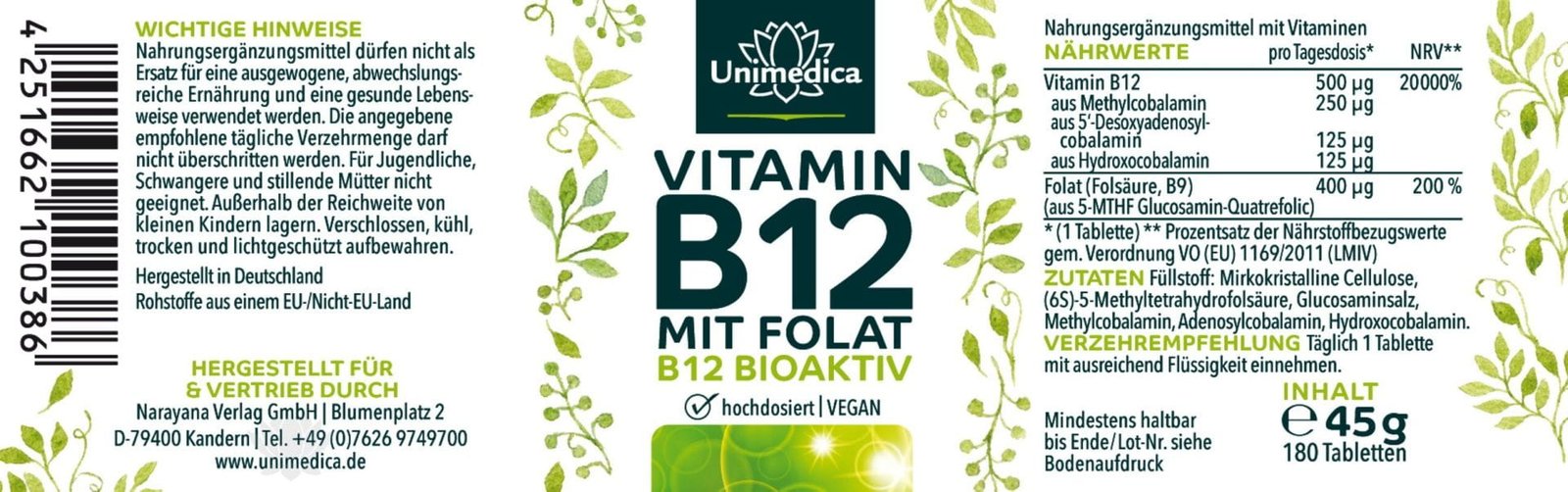 تحتوي كل جرعة يومية من فيتامين ب12 مع حمض الفوليك من يونيميديكا على 500 ميكروجرام من فيتامين ب12 و400 ميكروجرام من حمض الفوليك. تحتوي الأقراص على شكلي فيتامين ب12 النشطين بيولوجيًا ميثيل كوبالامين وأدينوسيل كوبالامين بنسبة 2:1 بالإضافة إلى شكل التخزين هيدروكسوكوبالامين. يتمتع فيتامين ب12 بمجموعة واسعة من النشاط ويشارك بشكل كبير في العديد من العمليات الأيضية في الجسم. يأتي فيتامين ب12 الموجود في أقراص حمض الفوليك عالية الجرعة حصريًا من التخمير الطبيعي.