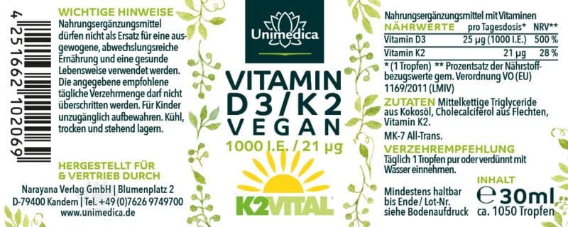 فيتامين د3 و ك2، نباتي.Veganes Vitamin D3 / K2 mit D3 aus Flechten mit K2Vital von Kappa – D3 1.000 I.E. 25 µg / K2 21 µg (1 Tropfen) pro Tagesdosis