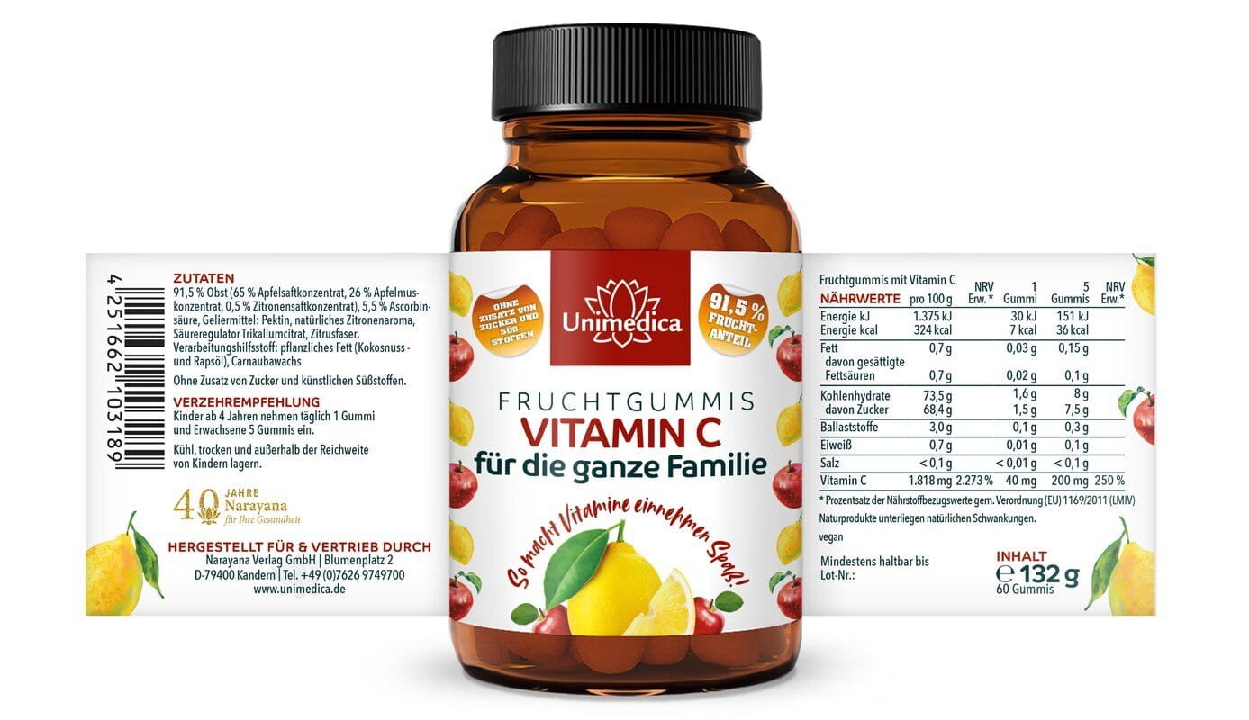 فيتامين سي لجميع أفراد الأسرة .Vitamin C Fruchtgummis für die ganze Familie – mit 91,5 % Fruchtanteil – 60 Gummis