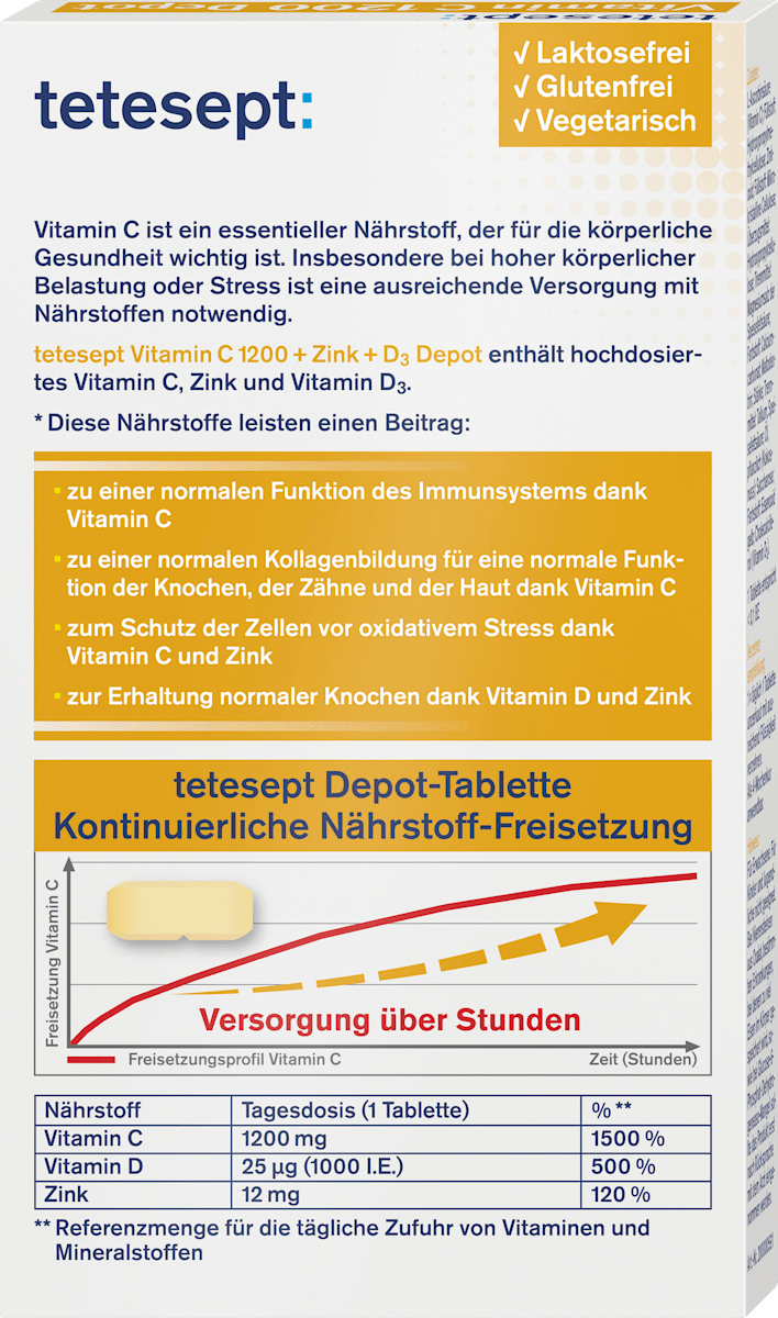 تحتوي أقراص فيتامين سي 1200 الممتدة المفعول مع الزنك وفيتامين د3 من tetesept على فيتامين سي عالي الجرعة والزنك وفيتامين د3. يمكن لفيتامين سي أن يساهم في وظيفة طبيعية للجهاز المناعي وكذلك في تكوين الكولاجين الطبيعي لوظيفة طبيعية للعظام والأسنان والجلد. يمكن أن تساهم التركيبة بين فيتامين سي والزنك في حماية الخلايا من الإجهاد التأكسدي. كما يمكن أن يساهم التفاعل بين فيتامين د والزنك في الحفاظ على العظام الطبيعية.