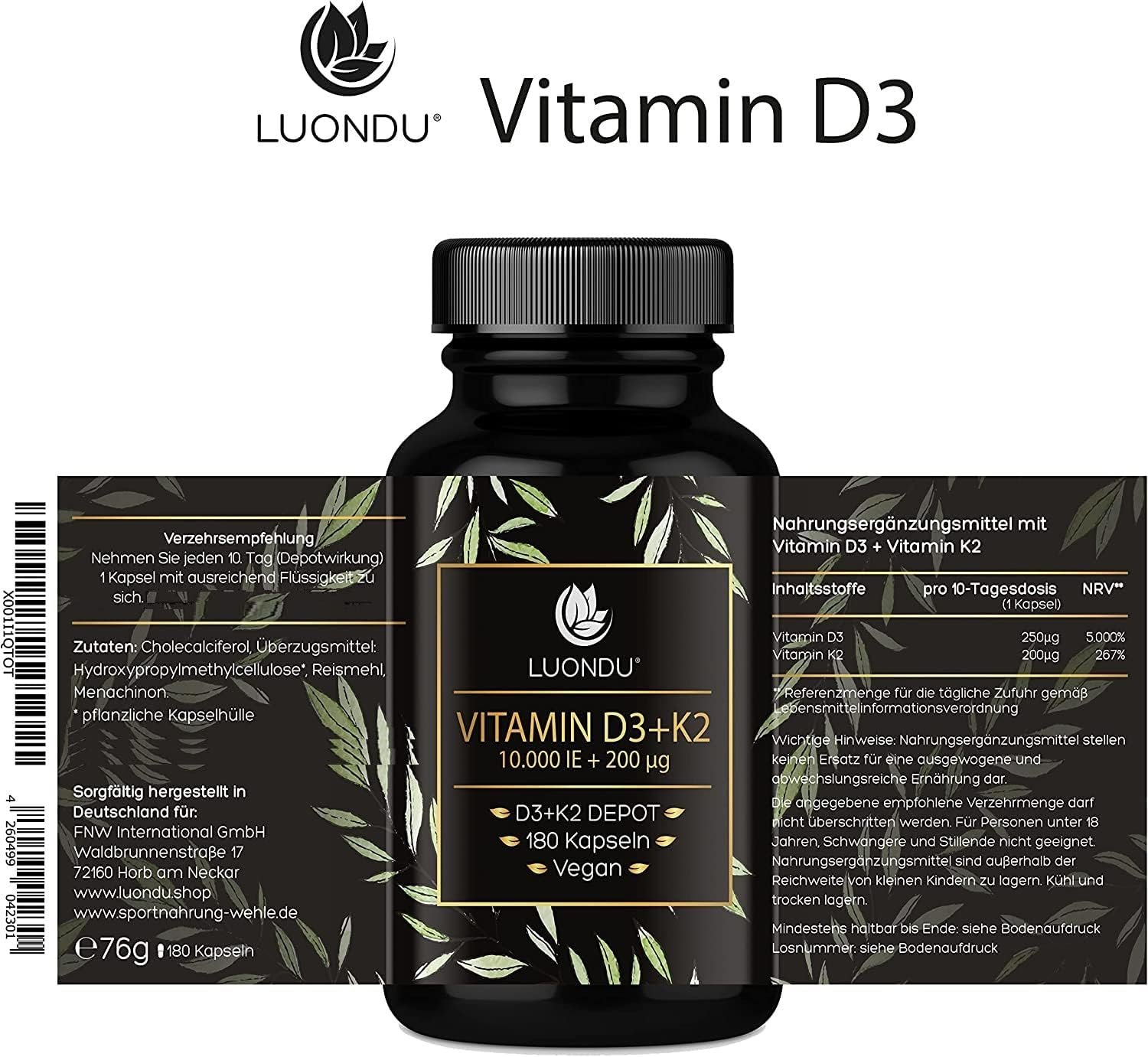 فيتامين D3 10,000 وحدة دولية + فيتامين K2 MK7 200 ميكروغرام (جرعة عالية ونباتي) | بدون إضافات، منتج في ألمانيا (180 كبسولة) – قد يختلف التغليف.D3+K2