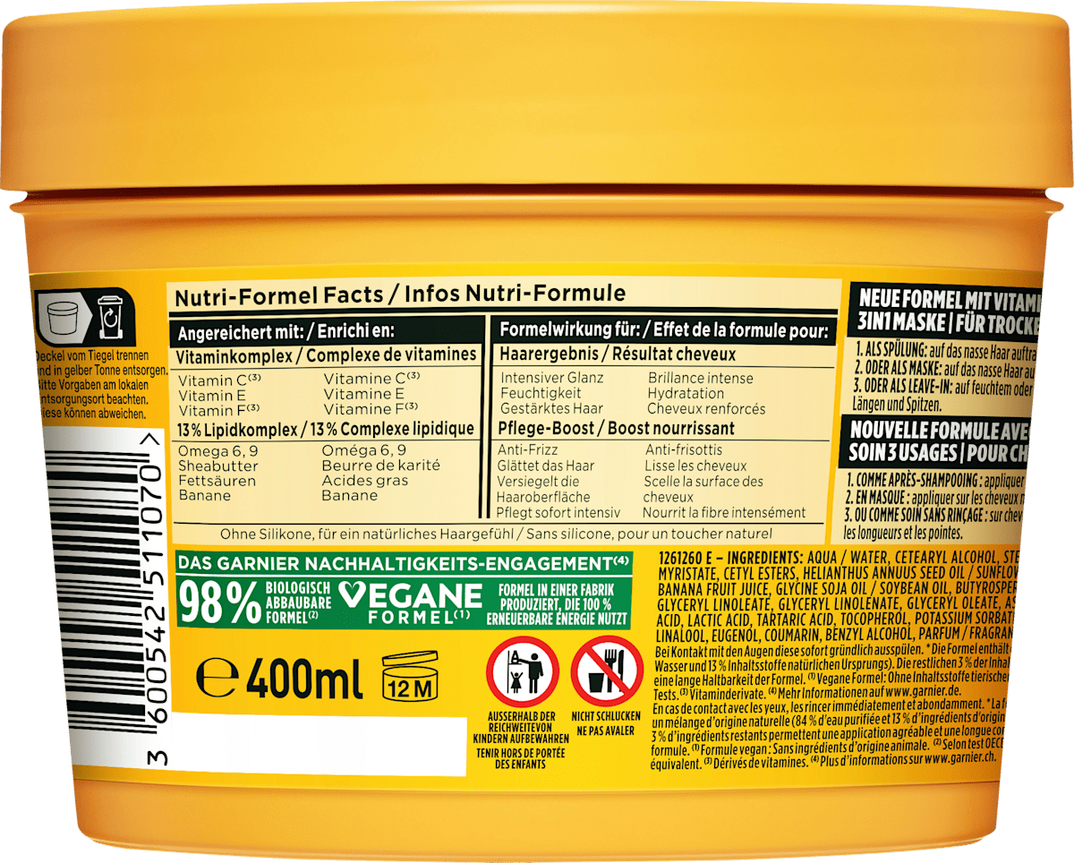 لقد تم تطوير ماسك Garnier Fructis Banana Hair Food 3in1 خصيصًا للشعر الجاف الذي يحتاج إلى عناية مكثفة. التركيبة مُغَناة بالموز لمنح الشعر المزيد من النعومة. العناية الثلاثية الوظائف يمكن استخدامها حسب الاحتياجات الفردية إما كبلسم أو كمسك أو كمنتج يُترك على الشعر: القوام الخفيف يمتص فورًا ويعتني بالشعر الجاف بشكل مكثف دون ثقل. كما أن التركيبة النباتية تتكون بنسبة 98٪ من مكونات طبيعية.