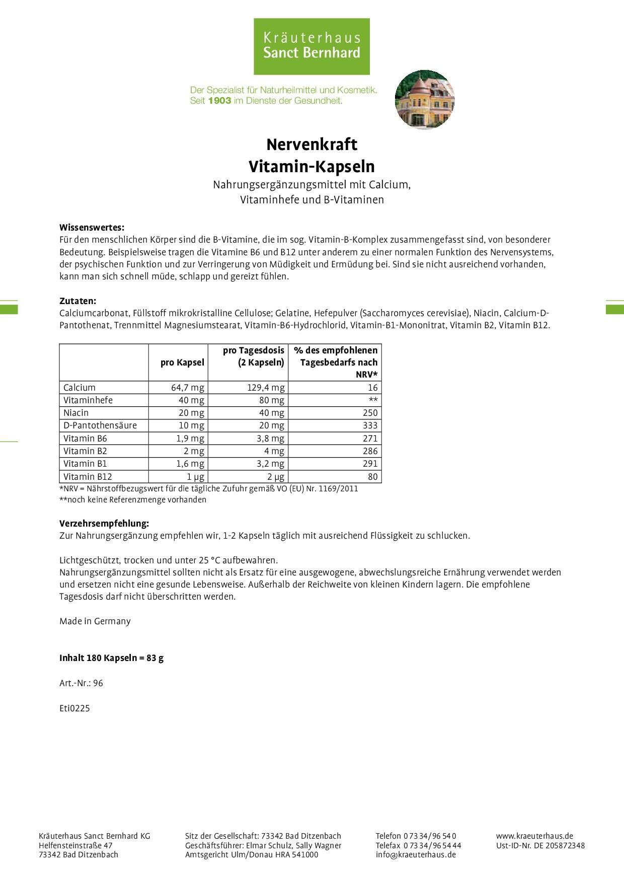 كبسولات فيتامين القوة العصبية.Nervenkraft-Vitamin-Kapseln 180 Kapseln
