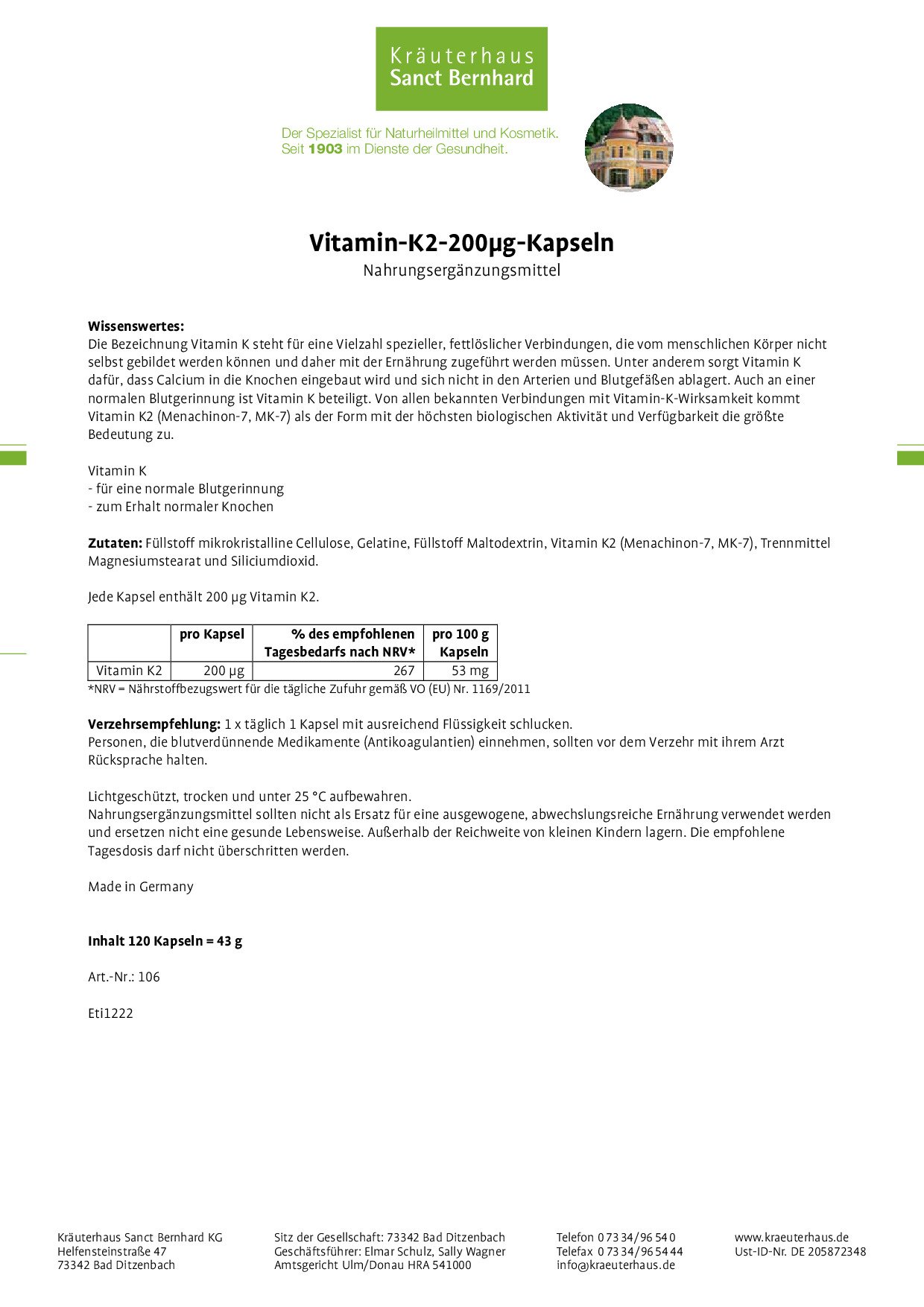 كبسولات فيتامين K2-200 ميكروغرام.Vitamin-K2-200 µg-Kapseln