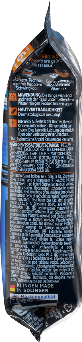 مع ماكينة الحلاقة ذات الثلاث شفرات التي تستخدم لمرة واحدة من Balea MEN، يمكنك الحصول على حلاقة شاملة وصديقة للبشرة بسهولة. الشفرات الثلاث الحادة، المصنوعة في ألمانيا، مطلية بالسيراميك وتنزلق بسهولة على الجلد لإزالة أي شعر بشكل موثوق. بفضل تقنية الشفرة الدقيقة ورأس التأرجح المرن، يمكن الوصول بسهولة حتى إلى أجزاء الجسم التي يصعب الوصول إليها. يضمن الشريط المنزلق المصنوع من الصبار وفيتامين E انزلاقًا مثاليًا للشفرة ويحمي البشرة في نفس الوقت. يوفر المقبض المضاد للانزلاق تحكمًا ممتازًا وتعاملًا آمنًا، مما يجعل الحلاقة أكثر راحة. مثالي لبشرة الرجال الناعمة ونتيجة حلاقة خالية من العيوب.