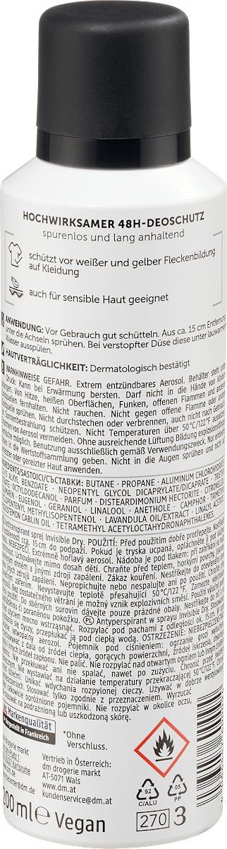مع مزيل التعرق Deospray Invisible Dry من Balea Men، يمكنك حماية نفسك من الروائح الكريهة دون ترك أي أثر. تركيبة متطورة للغاية تضمن رائحة منعشة لطيفة لمدة تصل إلى 48 ساعة دون التسبب في ظهور بقع صفراء أو بيضاء على الملابس. يأتي رذاذ مزيل العرق في عبوة مصنوعة من 50% من المواد المعاد تدويرها. وصفة خالية من المواد البلاستيكية الدقيقة والبوليمرات الاصطناعية البحتة القابلة للذوبان في الماء.